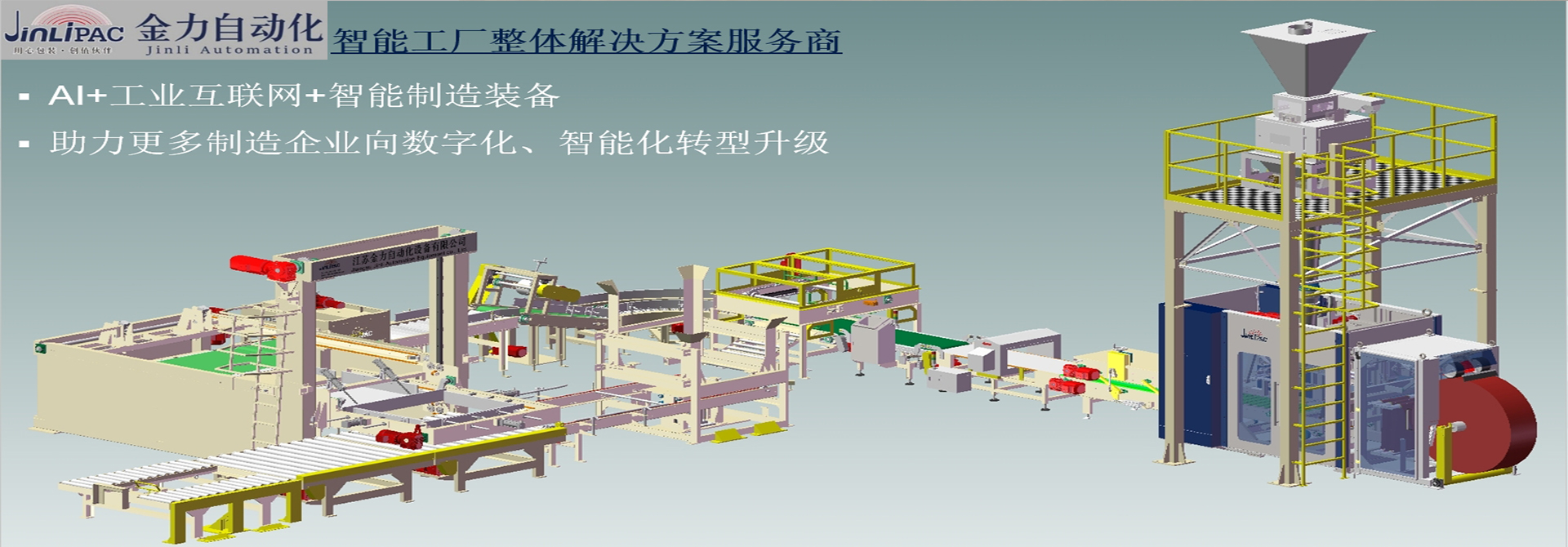JinlPac公司的粉粒料包装码垛成套系统主要广泛应用于粮食、饲料、化工、建材、食品和新材料等行业的颗粒状、片状、粉状类的物料后处理。该系统可将化工行业的粉状、粒状等散状物料(如合成树脂中的聚乙烯、聚丙烯、ABS树脂、聚氯乙烯、聚苯乙烯,工业盐、碱、磷氮钾肥、复合肥等)从称重、包装、金属检测、重量复检、码垛到仓储物流实现自动化无缝链接作业,可根据客户需求及不同物料特性提供特定的完整解决方案,生产线最大生产能力每小时2000包。